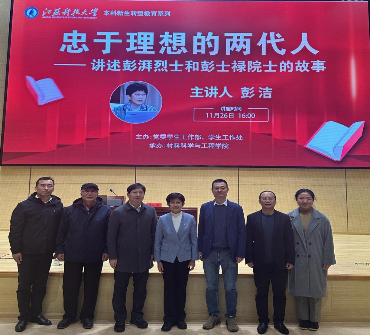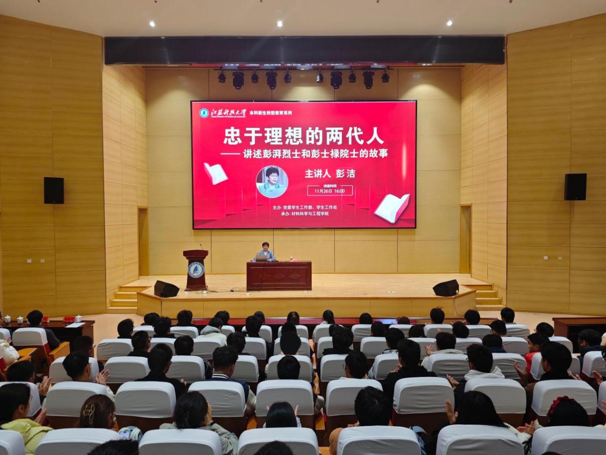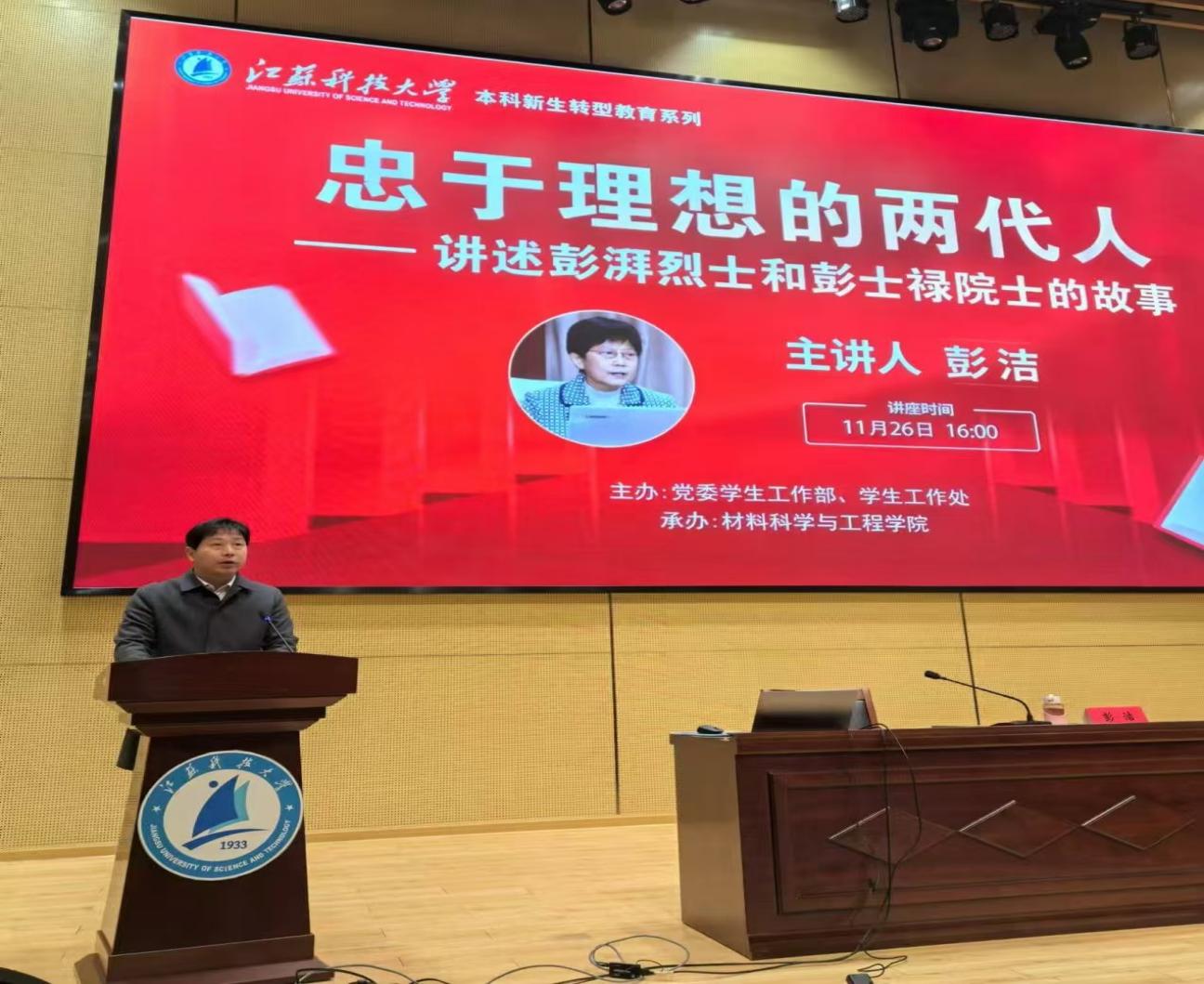 为全面提升学校人才培养质量,引导广大师生树立科学的世界观、人生观、价值观,11月26日,我校在行政楼100号报告厅开展“忠于理想的两代人—讲述彭湃烈士和彭士禄院士的故事”主题讲座。中华英烈褒扬事业促进会“薪火”红色宣讲团导师、中国科协科学家精神报告团成员、80级船舶电气自动化专业校友彭洁,做本科生新生转型教育系列报告,讲述彭湃烈士和彭士禄院士忠于理想,为共产主义事业奋斗终生的感人事迹。会议由党委常委、副校长胡爱祥主持。