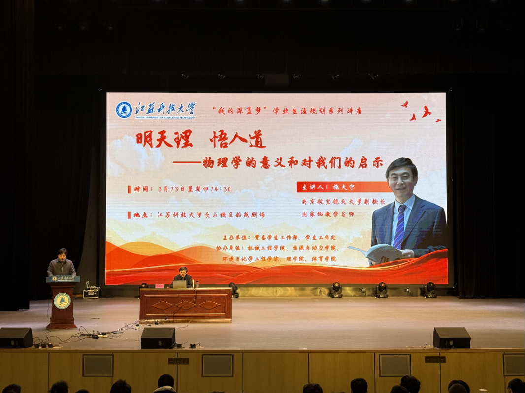 3月13日下午,我校在船苑剧场开展“我的深蓝梦”学业生涯规划主题讲座。全国政协委员、国家教学名师、南京航空航天大学副校长施大宁教授受邀出席作题为“明天理 悟人道——物理学的意义和对我们的启示”的专题讲座,各学院大一学生参加。讲座由党委常委、副校长胡爱祥主持。